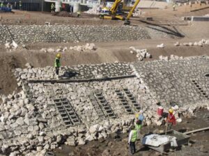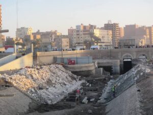 – جاري تنفيذ أعمال الطرق وتنسيق الموقع وتطوير وتجميل المنطقة، وإنشاء وتركيب أسوار الحماية.