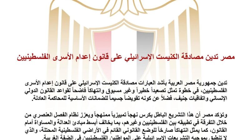 اصدرت وزارة الخارجية والتعاون الدولي والمصريين بالخارج بيان ادانت فية جمهورية مصر العربية بأشد العبارات مصادقة الكنيست الإسرائيلي على قانون إعدام الأسرى الفلسطينيين، في خطوة تمثل تصعيداً خطيراً وغير مسبوق وانتهاكاً فاضحاً لقواعد القانون الدولي الإنساني واتفاقيات جنيف، فضلاً عن كونه تقويضاً جسيماً للضمانات الأساسية للمحاكمة العادلة.
